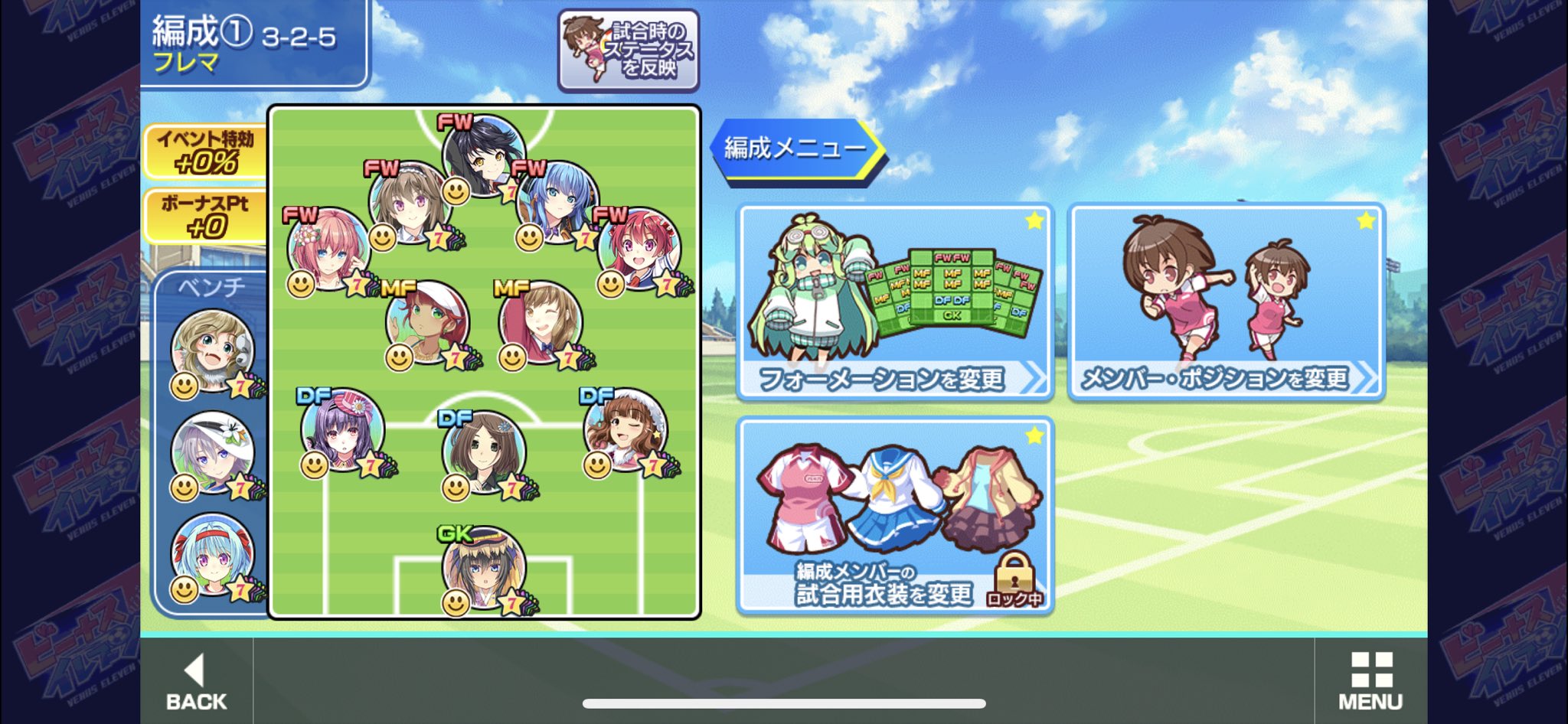 練習で5-2-3を採用してみたものの普通に突破されたので一層の事攻撃偏重で行こうと思い3-2-5で続投。